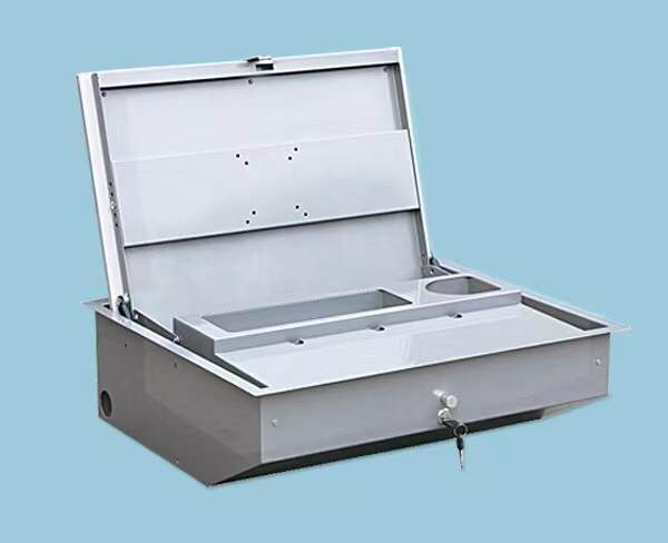 翻轉器采用1.2mm厚優(yōu)質(zhì)冷軋鋼板,外觀(guān)尺寸:565*445*160mm;開(kāi)孔尺寸:540*420mm。液壓桿采用進(jìn)口優(yōu)質(zhì)緩沖氣壓桿,力度為150N。帶鎖帶拉扣雙重保護結構,鎖距尺寸:80mm;拉扣孔距尺寸:53mm;箱體內部含有鍵盤(pán)槽、雜物槽與鼠標槽托板,鍵盤(pán)槽尺寸:484*160MM(長(cháng)*寬),鍵盤(pán)槽居中頂部帶有直徑2CM的出線(xiàn)孔。雜物槽尺寸:189*75*38MM(長(cháng)*寬*高),邊角為圓弧處理。鼠標槽型尺寸為:132*75*38MM(長(cháng)*寬*高),液壓氣桿展開(kāi)孔距:273mm。